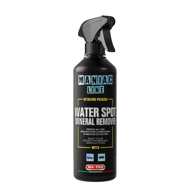 Maniac Waterspot & Mineral Remover is speciaal ontworpen om watervlekken en minerale afzettingen van lak, glas en andere oppervlakken te verwijderen zonder het materiaal te beschadigen. Herstelt de gladheid en helderheid van het oppervlak.