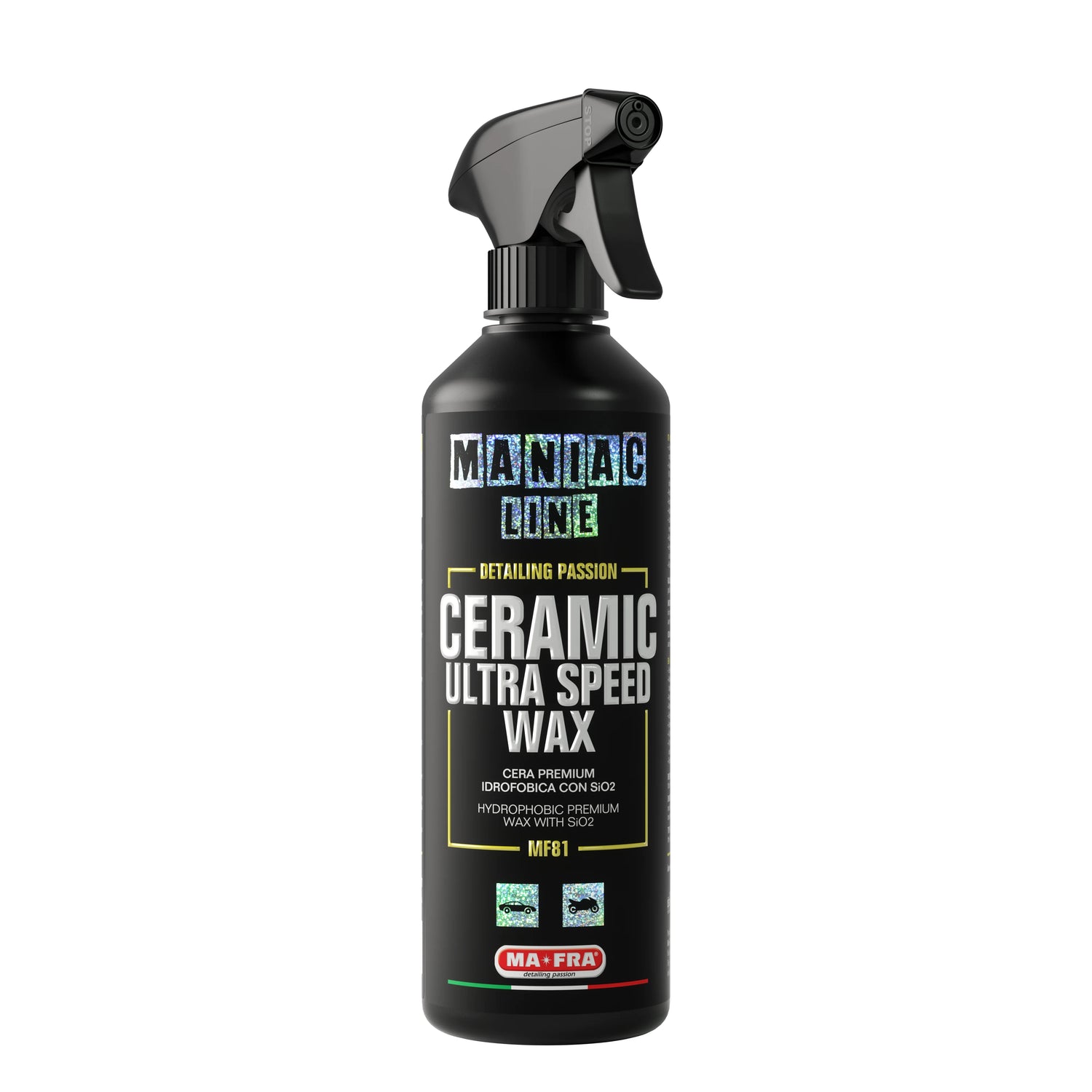 De Mafra Ceramic Ultra Speed Wax is een spraywax met SiO₂ die een duurzame, waterafstotende en glanzende beschermlaag op voertuigen aanbrengt.
